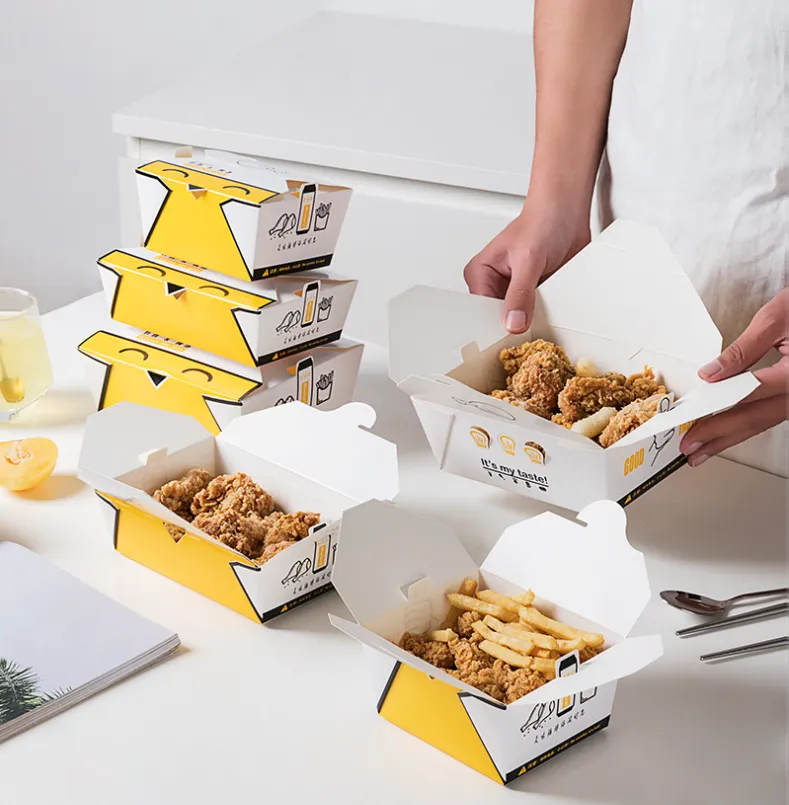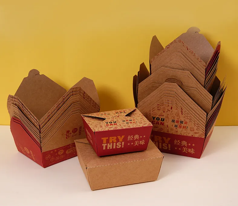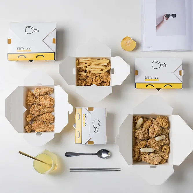 Fried Chicken Box е вид контейнер за опаковане на пържени пилешки хартия, специално проектиран за индустрията за бързо хранене. Пърженото пилешко кутия е изработена от картон за храна, който е устойчив на високи температури и масла, водоустойчив и теч, подходящ за горещо и студено и лесен за опаковане. Това е практична кутия Friedchicken с добро уплътняване и изолация, която може ефективно да поддържа свежестта и температурата на пърженото пиле. Fried Chicken Box, произведена от Zemeijia Factory, поддържа персонализиран печат и е подходящ за изнасяне, кетъринг и парти сцени.