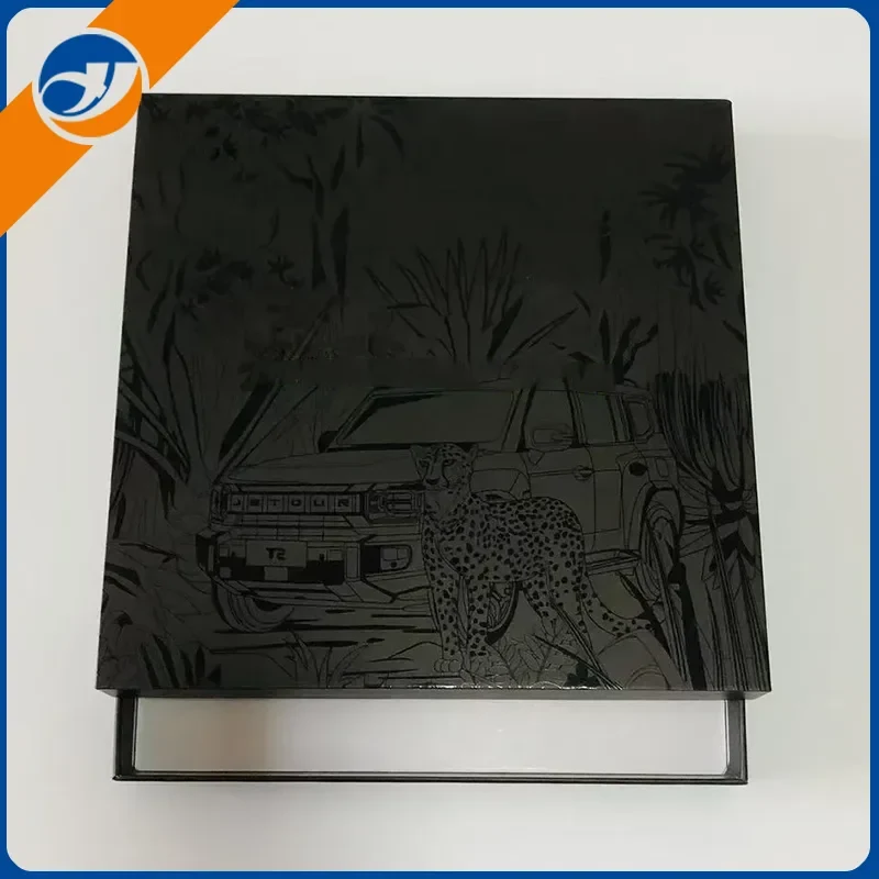 Черната подаръчна кутия с матово щамповане е изработена от специална хартия и фазер, като предлага деликатно докосване, като същевременно е устойчива на износване и надраскване. Повърхността му е устойчива на пръстови отпечатъци, подчертавайки първокласна текстура. Капакът разполага с 3D релеф с шарки на джунгла, леопард и офроуд превозни средства, допълнени от лога на марката със златно фолио. Класическата черно-златна цветова схема излъчва лукс с отчетливо наслояване. Проектирана в плоска структура на капак от небето и земята, кутията се отваря и затваря плавно, поддържа твърда форма без деформация и разполага с плоско вътрешно пространство, идеално за съхранение на тънки луксозни предмети. С темата „изследване“ на черната подаръчна кутия с матово щамповане, дизайнът съчетава привлекателност на открито с изискана елегантност, като ефективно укрепва имиджа на марката и запомнянето. Освен това подаръчната кутия поддържа пълна персонализация, включително релефни шарки и златно фолио, за гъвкаво посрещане на различни персонализирани нужди от опаковки.